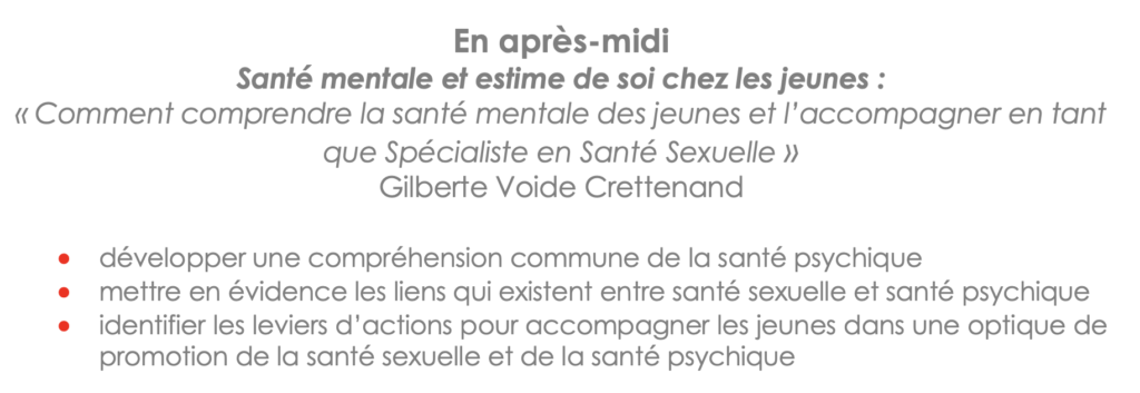 Gilberte Voide Crettenand après une licence en sciences sociales et pédagogiques à l’Université de Lausanne a occupé différents postes dans le domaine des addictions et de l’éducation sociale. Elle a ensuite travaillé pendant 20 ans dans le domaine de la promotion de la santé sexuelle. Actuellement elle est responsable de la formation à santepsy.ch. Elle a contribué en tant que conseillère pédagogique au développement de #MOICMOI, une approche de promotion de la santé psychique des adolescent.e.x.s basée sur les compétences psychosociales. Elle est l’autrice de trois cahiers de références en promotion de la santé psychique (5-11ans ;12-15ans ; 16-25ans) édités par santepsy.ch pour soutenir les personnes qui accompagnent professionnellement des enfants et des jeunes. Elle est aussi membre du groupe d’accompagnement et formatrice du système des drapeaux porté par SANTE SEXUELLE SUISSE (Flag System).