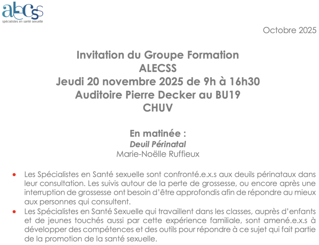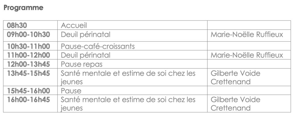 Lors de cette formation Marie-Noëlle Ruffieux abordera les différentes formes de pertes de grossesse et les spécificités du deuil périnatal, à partir de vignettes et de situations rencontrées sur le terrain. Elle proposera des outils, des ressources, des pistes concrètes et des repères pour les personnes qui accompagnent et qui informent sur ce sujet.